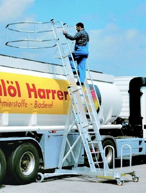 Zarges Tanker Ladders are specifically designed for accessing,servicing, repairing, filling and cleaning road tankers or any large vehicle with a roof designed to take the weight of a person.. These mobile ladders are used primarily on road tankers in a range of different industries, this includes; the food industry, the chemical and petrochemical industries and on rail vehicles. This tank access ladder comprises a two part extension ladder with a maximum load of 150 kg, which is conveniently height adjustable via a side-mounted winch from ground level. The ladder is totally self supporting and so will not damage bodywork or livery. The basic design can be configured or modified to suit your individual requirements as each tanker ladder is built to order.