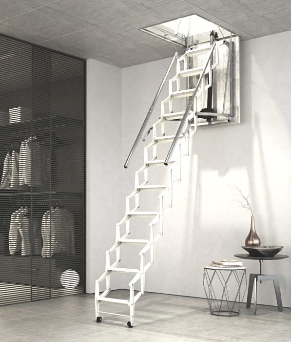 • The Motora electric concertina loft ladder is manufactured from white powder coated sheet steel and stores completely within the hatch space.