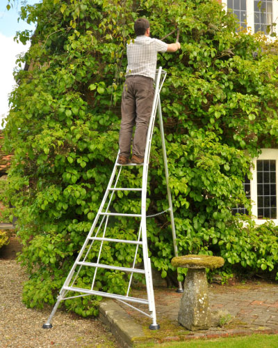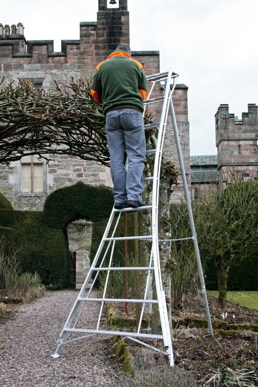 The third leg is telescopic, and the ladder easily straddles over shrubs and low fences and walls, so depending on the task you can work face-on with the third leg planted into a hedge, or sideways with the side of the base parallel to the task, giving the perfect working position. A flat top allows you to rest baskets or tools. Made from welded extruded aluminium, the ladder is lightweight yet strong, handling a maximum working load of 150kg (23.5st).