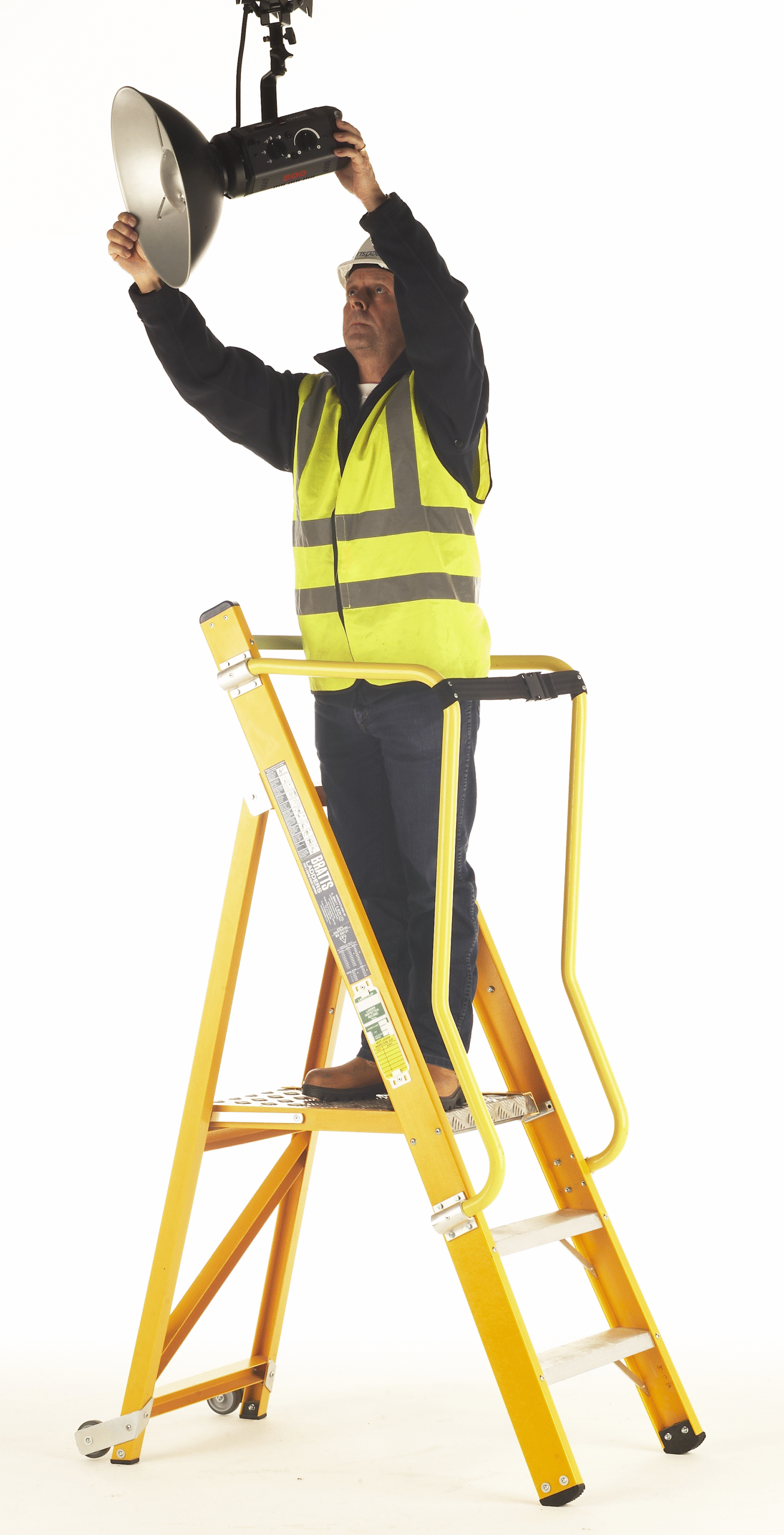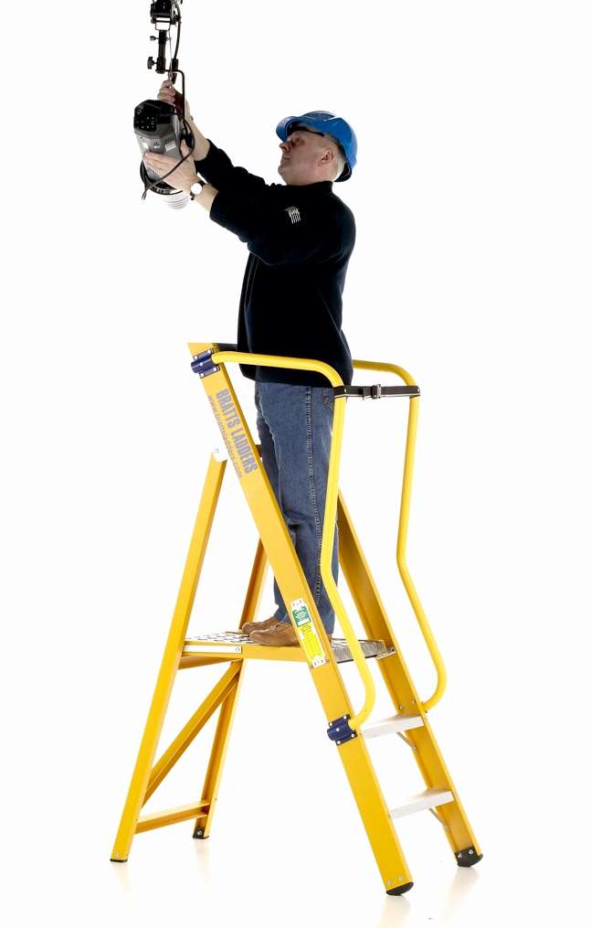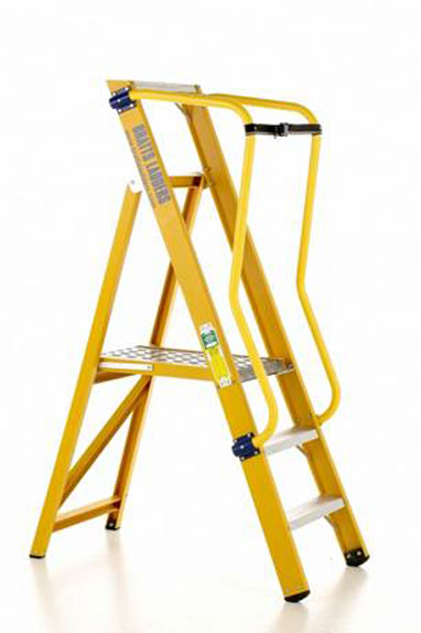 Ergonomically designed for industrial use, the superb fibreglass VISION 360 is insulated and non-conductive whilst in use and HSE compliant to work two-handed for up to 30 minutes. Manufactured from distinctive yellow 85mm x 31mm stile channel and 45mm x 35mm back leg channel, the steps are tested and Kitemarked to BS EN131 and comply to – ANSI 14-5 and ESI 13-1. The steps have a glass fibre frame with aluminium treads incorporating a large – 400mm wide by 550mm long – platform which folds away when not in use. The platform locks into position and will support a max load of 150kg (23.5st) and is enclosed on 3 sides for safety by dual aluminium handrails (yellow plastic coated handrails may be specified). An optional extra security webbing strap can be bought with the steps to close off entry/exit (choose from options when adding to cart)