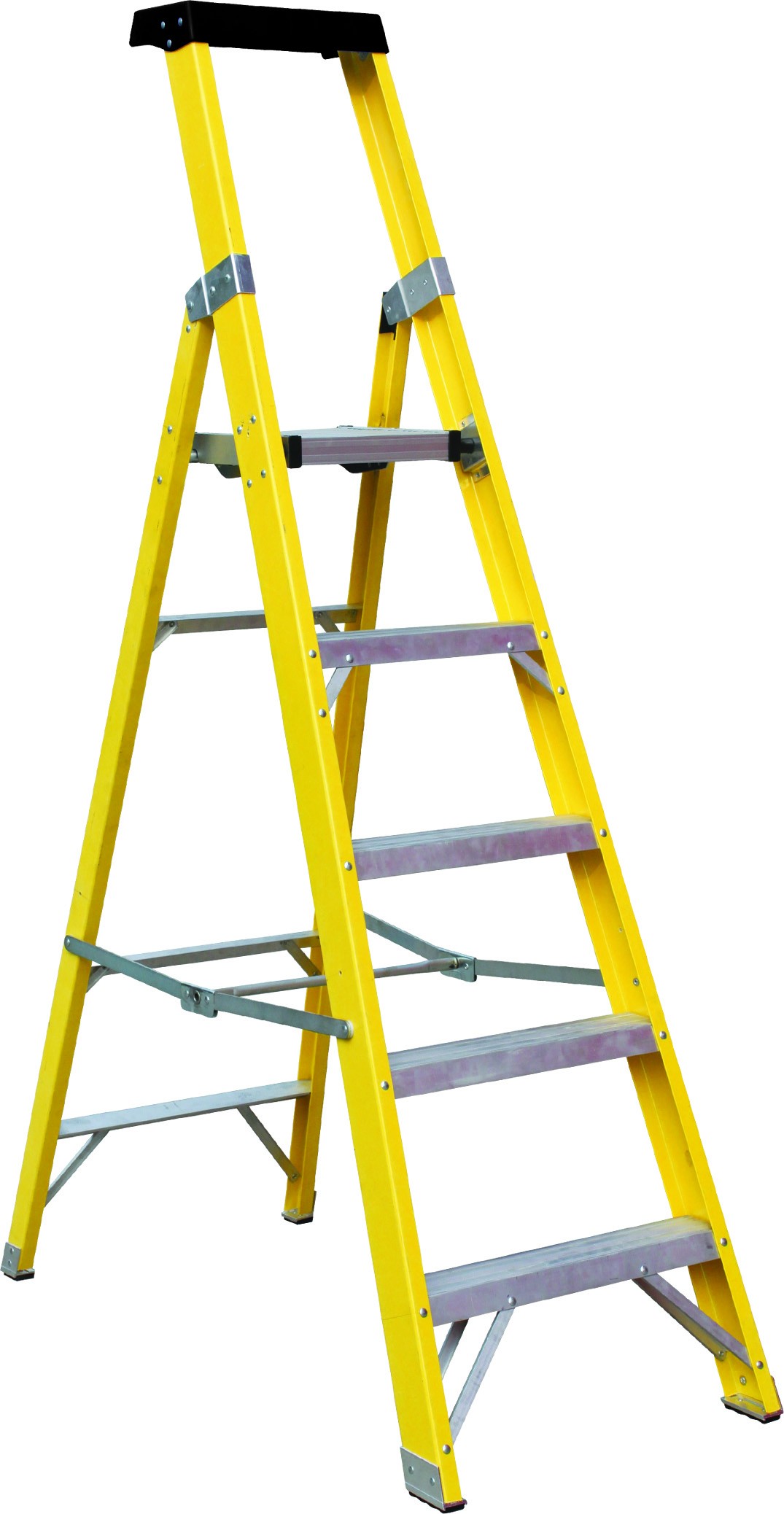 Heavy duty fibreglass stiles with large serrated steps and rubber feet provide insulated non-slip working in the most testing of environments, while strong metal side braces and large plastic moulded tool tray make this a very versatile and cost-effective step ladder for all industrial and trade situations.