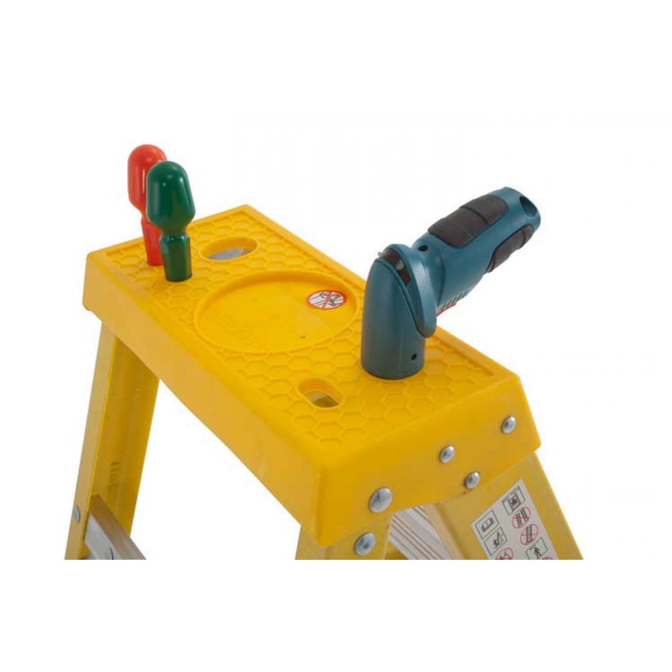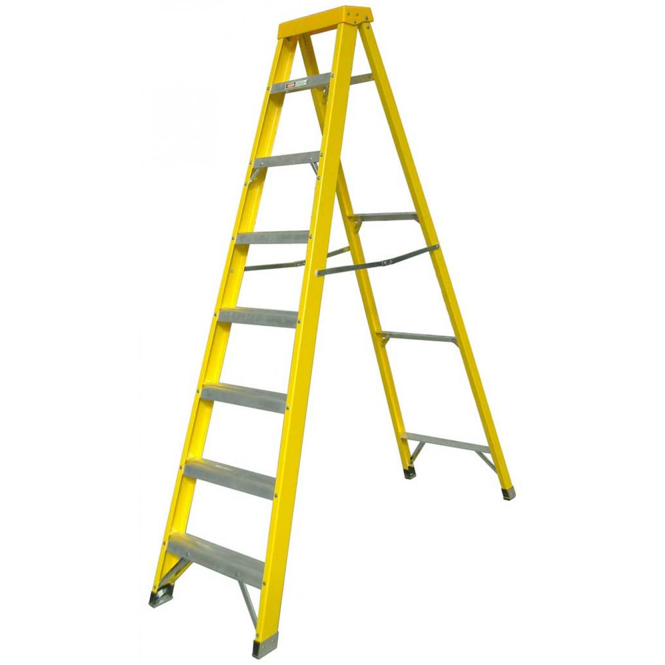 Sturdy industrial heavy duty step ladders with the added benefit of non-conductivity for safe working at height in electrical environments. Constructed in a “builder’s style” these high-quality steps are tested to EN131 150Kg and electrically insulated with 1 – 30,000 volt bleed ratio. Heavy duty fibreglass stiles with large serrated steps and rubber feet provide insulated non-slip working in the most testing of environments, also strong metal supports and large plastic moulded tool tray make this a very versatile and cost-effective step ladder for all industrial and trade situations.